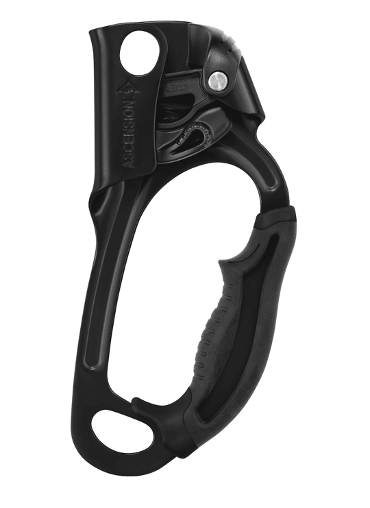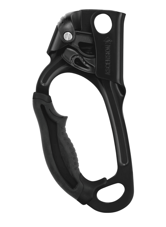 The ASCENSION handled rope clamp is designed for rope ascents and features an overmolded grip and ergonomic upper part for a comfortable and powerful grip when pulling with one or two hands. The ASCENSION handled rope clamp has a wide lower hole for easily attaching two carabiners for a lanyard and footloop.
