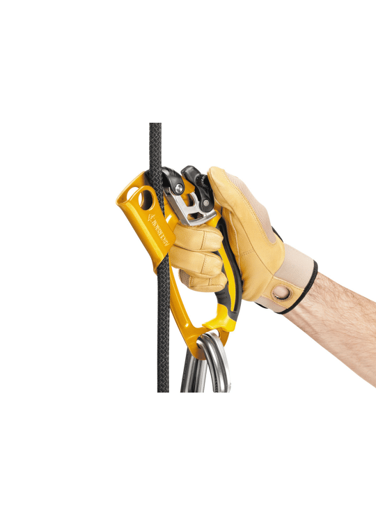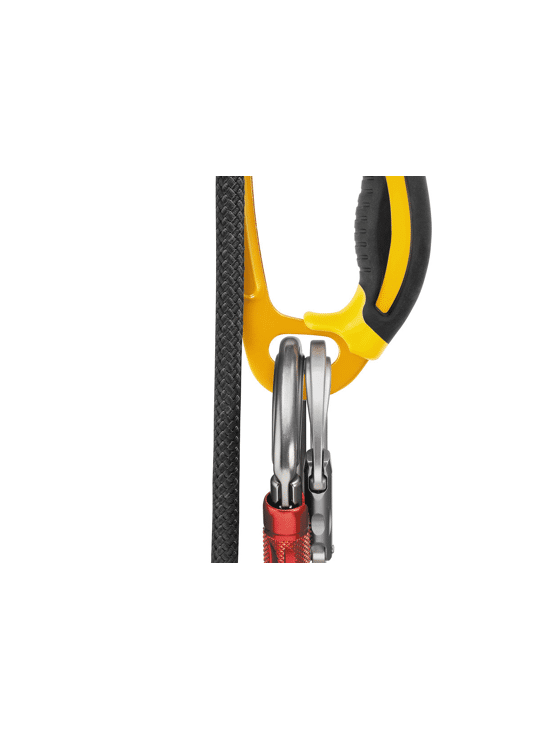 - upper hole for clipping a carabiner around the rope - Available in left- or right-handed and in black/yellow or black versions